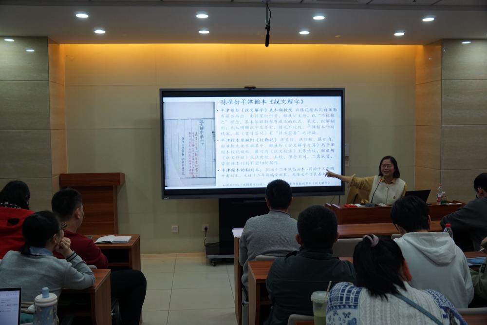 2025年10月24日,北京师范大学文学院古代汉语研究所副教授董婧宸老师受邀做客我院,于知新楼A606教室开展题为“《说文解字》的版本源流概述”的专题讲座。本次讲座是我院“古文字与出土文献研究前沿”系列讲座的第5场,由我院王辉教授主持,人民文学出版社古典文学编辑室董岑仕老师、我院刘祖国教授、高中正教授、伊强副教授、姚文昌副教授出席,40余名学生到场,现场学术氛围浓厚。