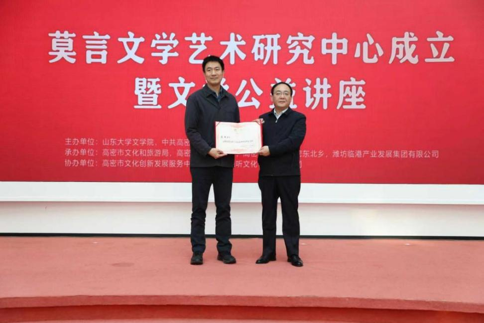 2025年11月8日,莫言文学艺术研究中心在潍坊高密市东北乡正式揭牌成立。该中心由我院与高密市共同推动建立,是深化校地合作、加强新时代中国文学研究的重要举措。双方在今年9月签署了合作协议,中心的揭牌标志着校地协同在文学研究与文化传承领域迈出了实质性步伐。