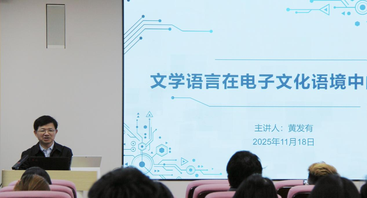 2025年11月18日下午3时,我院院长黄发有教授于知新楼A座620室为“当代美学前沿:东方与西方”国际学术研习营同学做题为“文学语言在电子文化语境中的变异”的讲座。讲座由山东大学文艺美学研究中心、我院主办,由我院副院长杨建刚教授主持,山东大学文艺美学研究中心韩清玉教授出席,来自国内数十所高校的硕博研究生参与讲座。