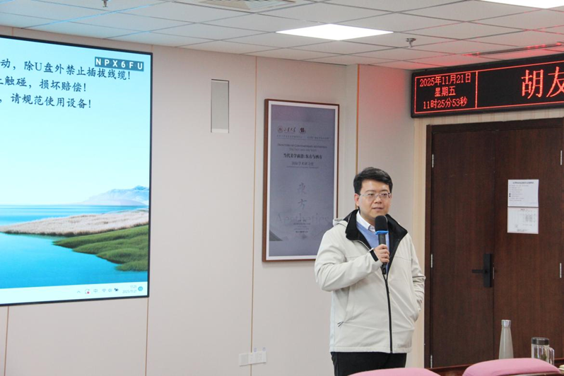 11月21日。胡友峰教授以“关于自然美理论研究中的若干基础问题”为主题,结合学术经历分享研究方法,从五维度阐释自然美本质,重点提出“文献+思维”论文写作方法论,建议建立“个人资料库”,通过案例解析强化实践指导。他还强调跨学科研究趋势,鼓励打破学科壁垒,关注科技发展。