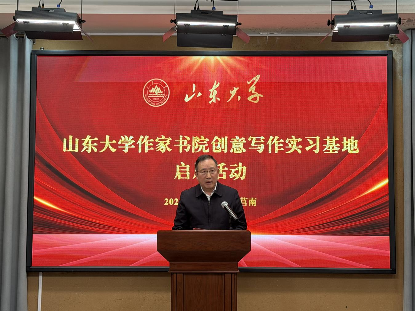 我院党委书记郭春晓强调,莒南富集文化与红色资源,地方政企聚力支持山大作家书院创意写作实习基地建设,开启了校地校企合作新篇。我院常务副院长马兵指出,创意写作实习基地为山大师生搭建重要实践平台,期待在这片热土上孵化创意写作后备人才。山东大学作家书院执行院长、特聘教授赵德发分享创作经验,期许在两地沃土孕育精品佳作。