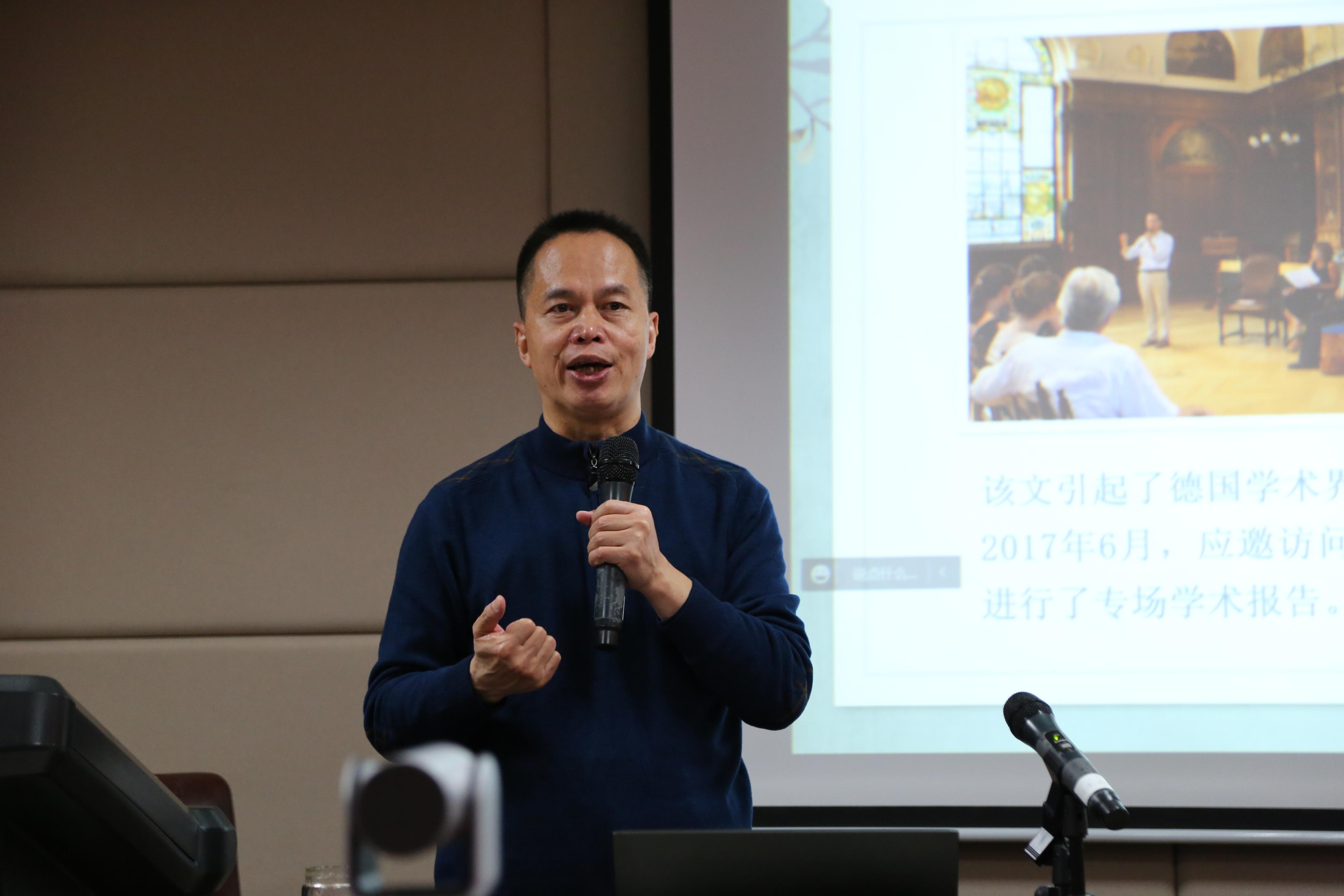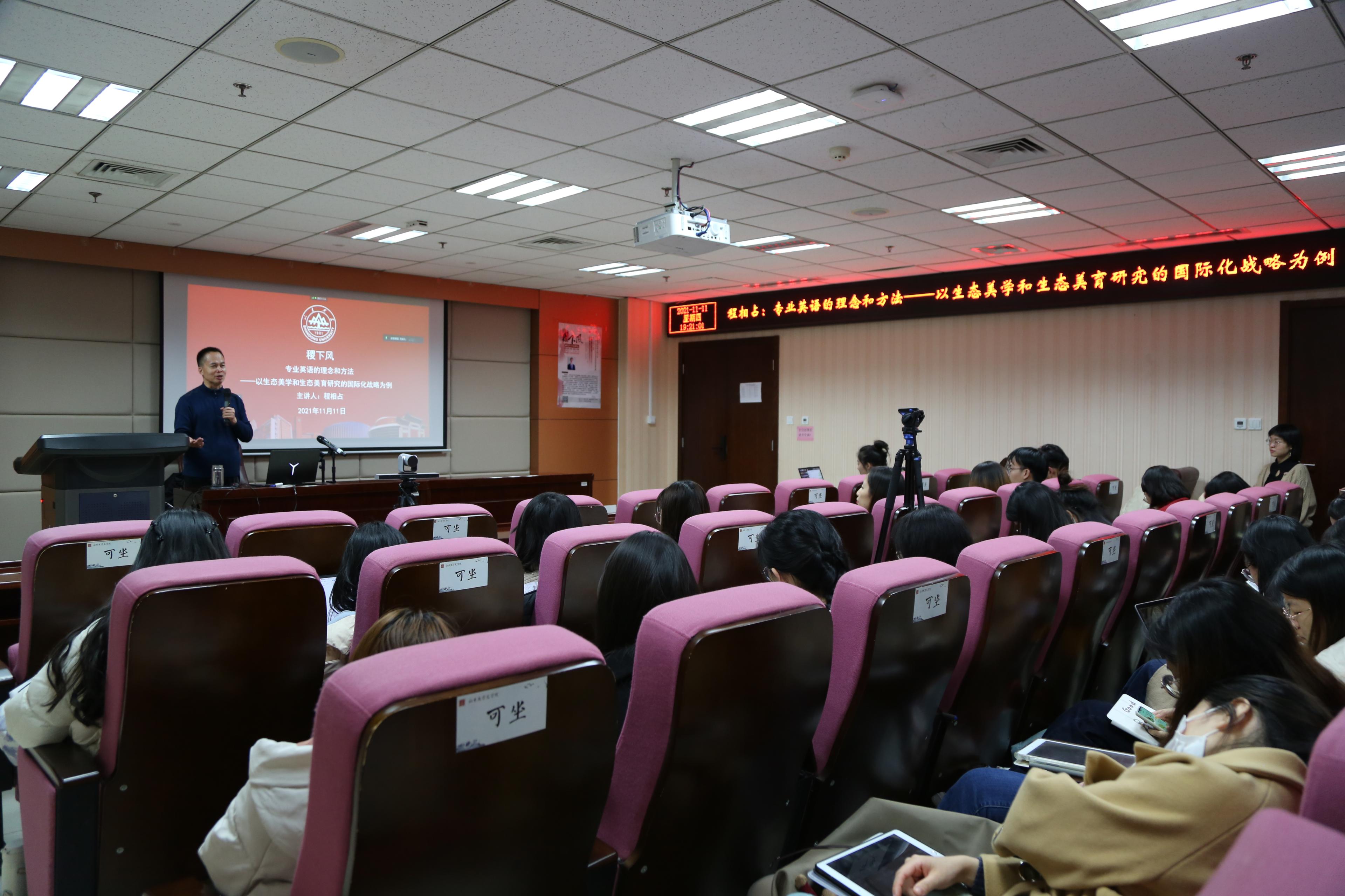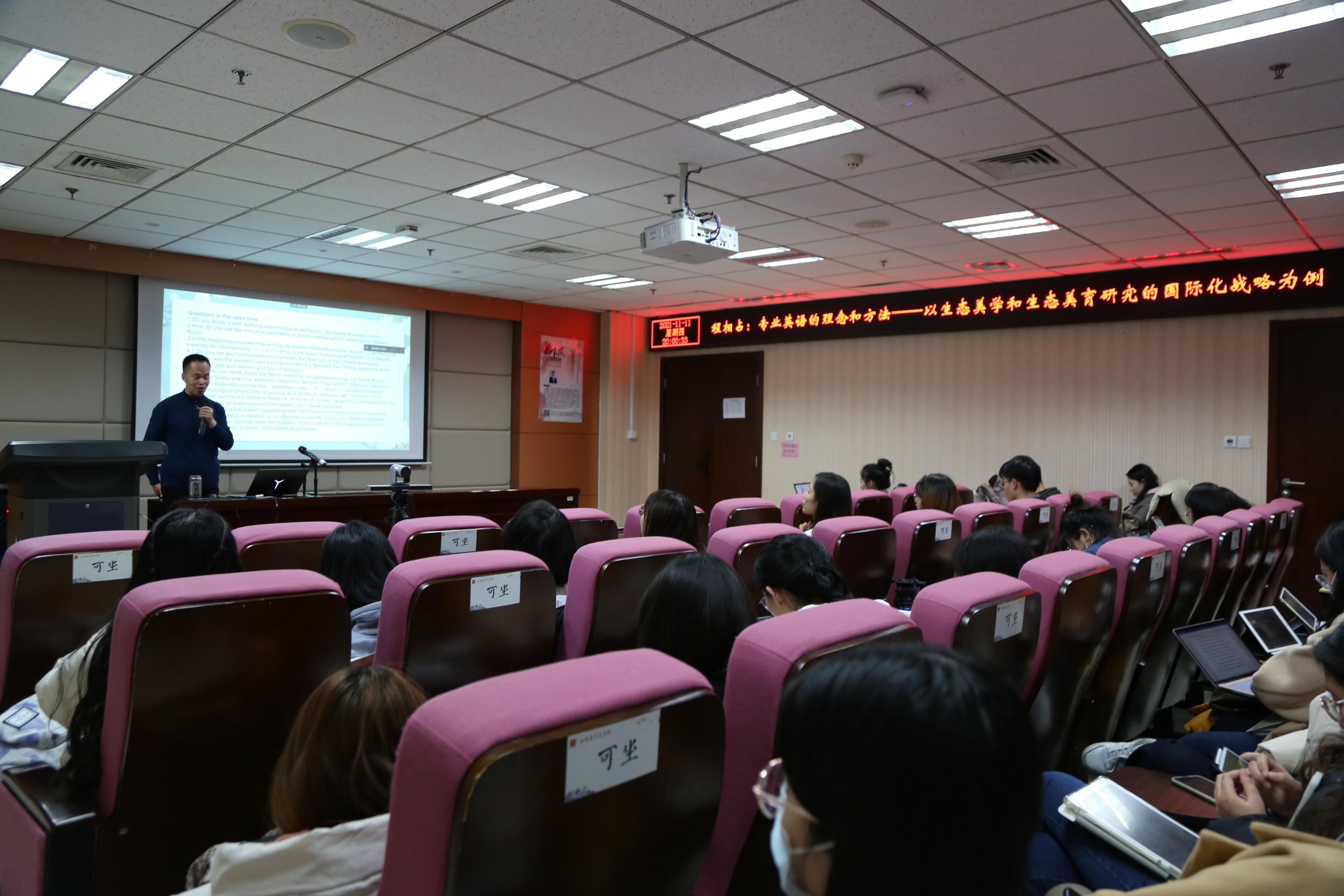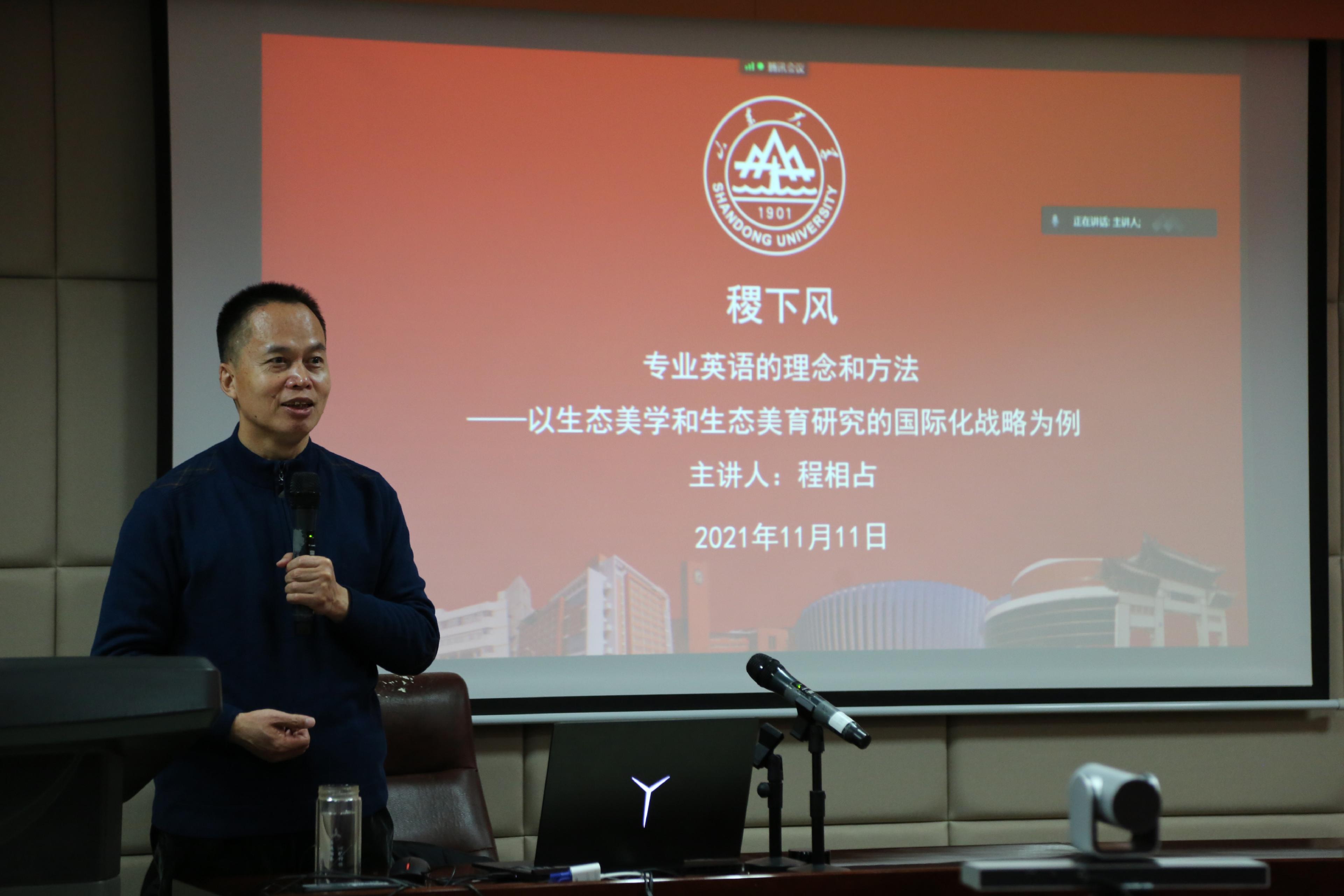 11月11日晚,山东大学文学院副院长、山东大学文艺美学研究中心副主任程相占教授做客第118期(总第1107期)“稷下风”研究生学术讲坛,于知新楼A620作题为“专业英语的理念和方法——以生态美学和生态美育研究的国际化战略为例”的讲座。本次讲座由文学院研究生会学术部副部长庞博主持,通过腾讯会议实时直播,吸引了校内外百余名师生参与。