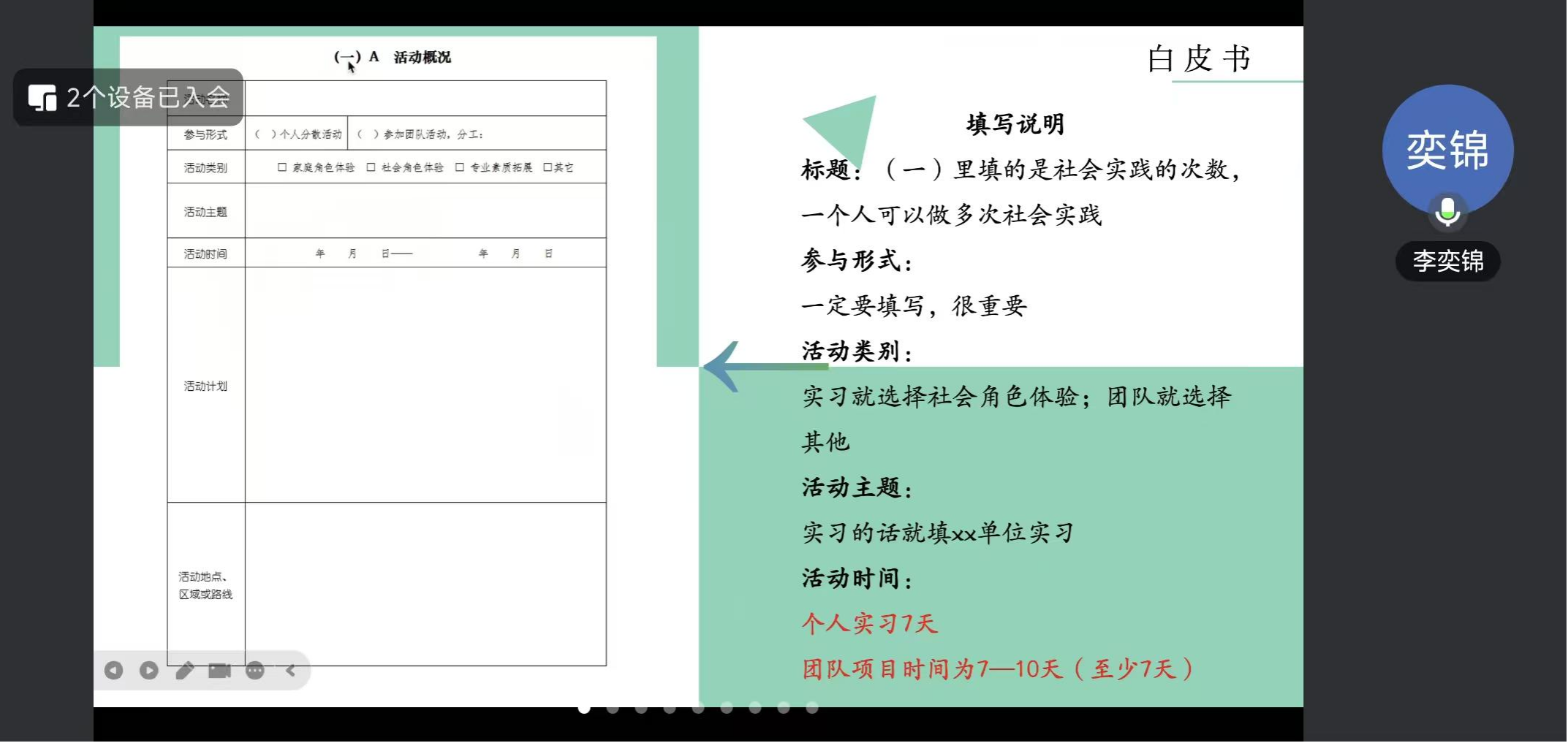 随后是社会实践白皮书与结项书填写规范的讲解环节。社工部结合往期优秀案例,逐项解析白皮书封面信息、实践日志、活动概况、活动总结等材料的格式要求,与结项书中的需写明实践主题、背景意义、预期成果、详细活动计划等内容的填写规范。帮助同学们准确把握材料撰写的要求,避免常见错误。