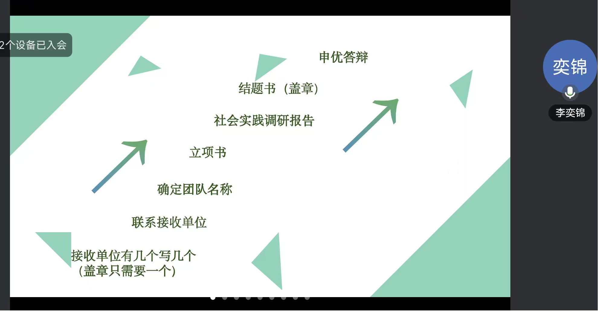 接下来是社会实践主题与流程介绍环节,会议首先强调了白皮书的填写注意事项,向同学们说明白皮书分为个人实习、院级普通立项和校级专项立项三部分,以及个人实习需满足的条件。第二部分,会议介绍了本次社会实践的选题和立项流程,展示了院级立项以及校级特色专项的主题,并对立项、开展、结项、评优、报销五个阶段的要求进行详细说明,让同学们对社会实践的推进有了清晰认知。
