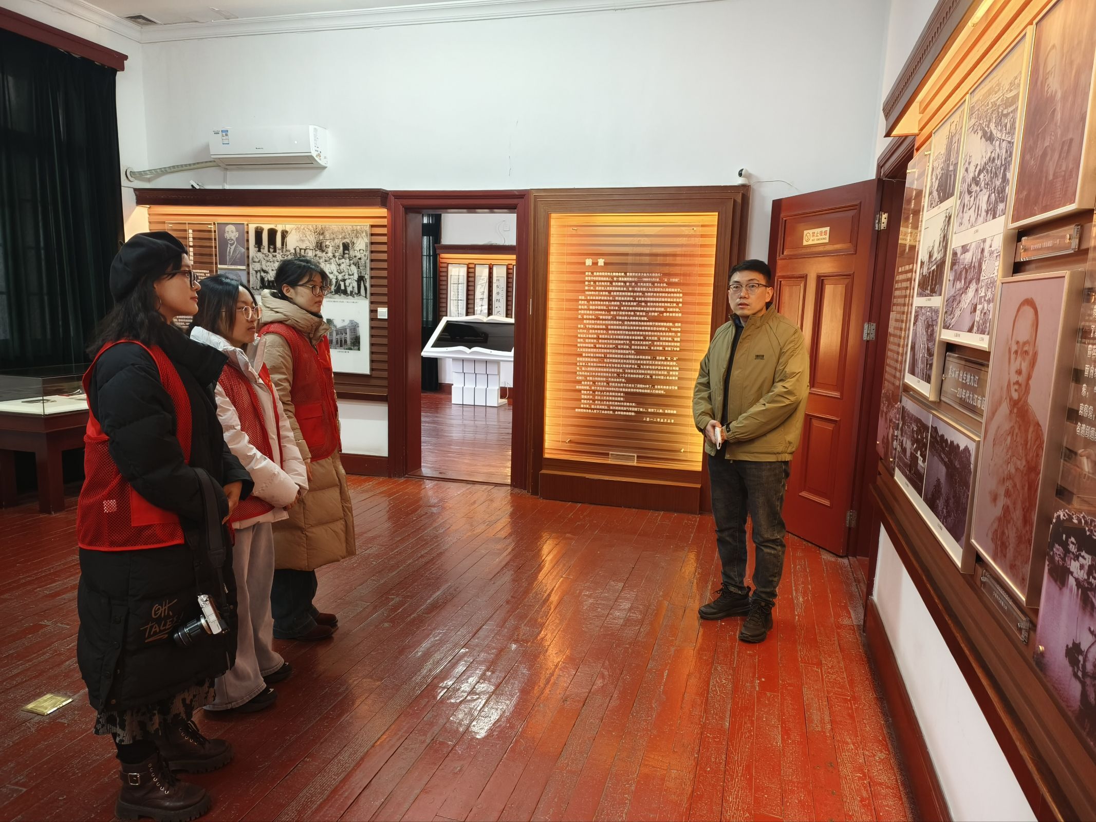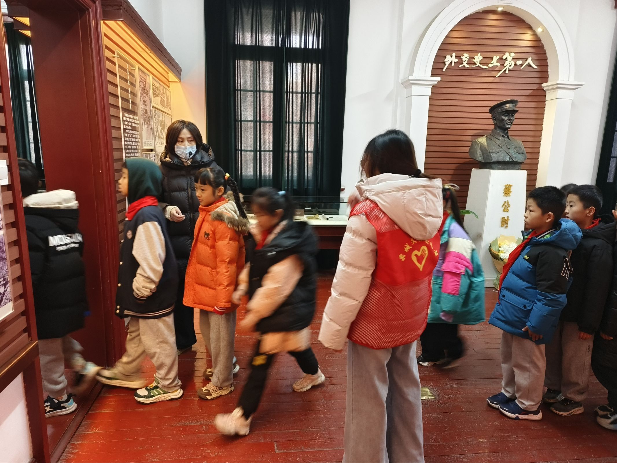 随后,团队成员按既定分工投入志愿服务。活动当天,纪念馆陆续接待了包括中小学生研学团队及家长在内的四批参观团体。团队成员分别值守于入口、主要展线等关键位置,主动引导参观人流,细致提示参观礼仪,全力维护馆内庄严有序的参观氛围。针对小学生群体的认知特点,团队成员耐心提供路线指引与参观答疑,展现了良好的精神风貌。
