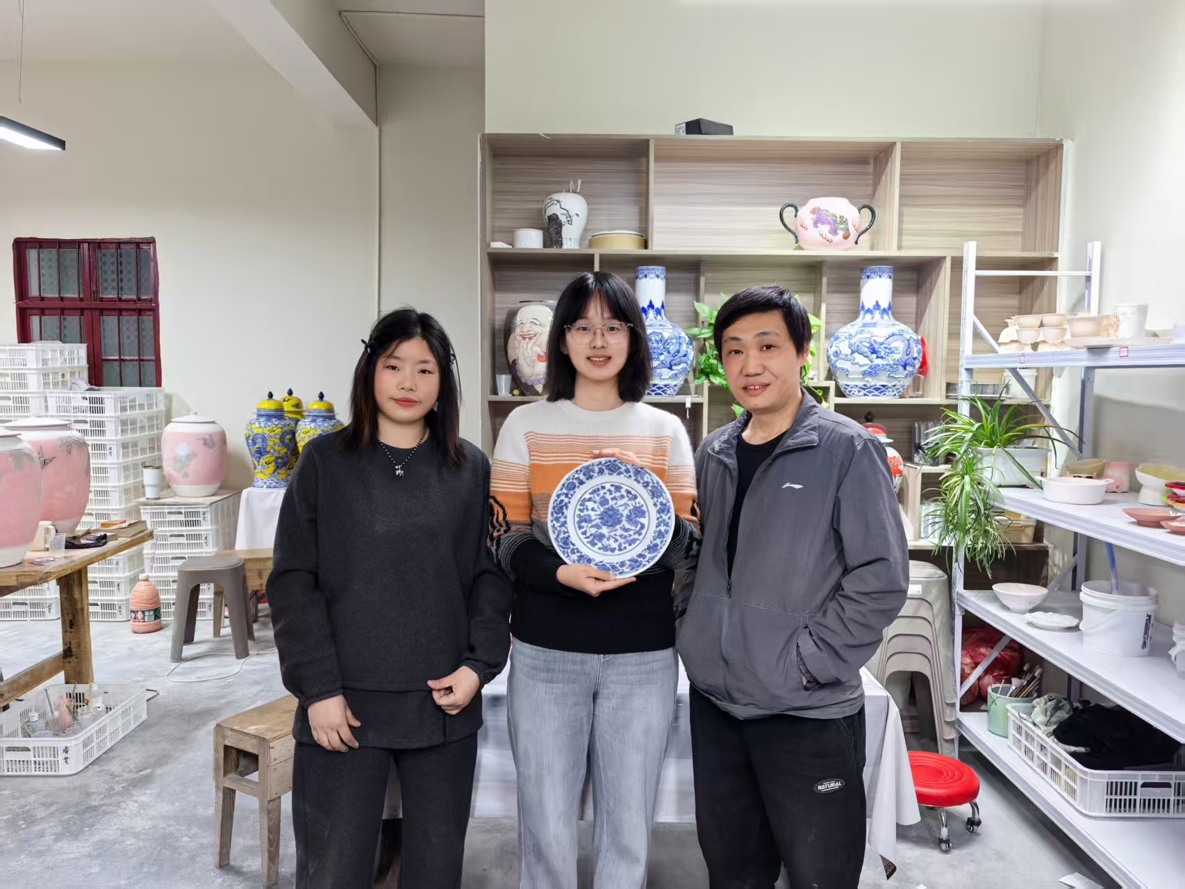 在景德镇,实践队走访了王国成非遗传承工作室,深入了解景德镇瓷器制作技艺的历史脉络与当代传承情况。从揉泥、拉坯到绘彩、烧制,王国成向队员们细致讲解了瓷器制作的工艺体系,并重点介绍了青花汾水这一关键技艺的文化内涵与技术难点。他谈到,瓷器不仅是日用品,更是中华审美与礼仪文化的载体,其传承关键在于“手传心授”。队员随后亲自尝试了青花汾水环节,切身感受到每一笔所要求的专注与功力,也更深刻理解了手艺人所坚守的“匠心如瓷”的温度。