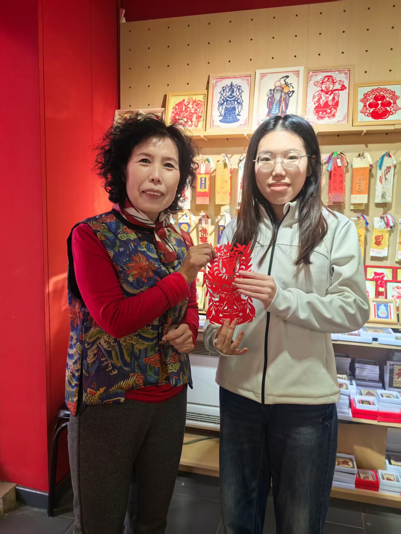 围绕非遗的“活化”与传播路径,实践团对当前满族剪纸相关的文创产品市场进行了专项调研。团队成员走访了位于义县奉国寺内的非遗文创商店,细致考察剪纸元素与日常用品、文具装饰及时尚设计的融合案例。通过分析现有文创产品的设计理念、市场定位与消费反馈,团队与经营者就当前产品开发的优势与瓶颈进行了探讨,思考如何在保持传统韵味的同时,提升剪纸艺术的市场适应性与可持续发展能力,从而使其更自然地融入现代生活。