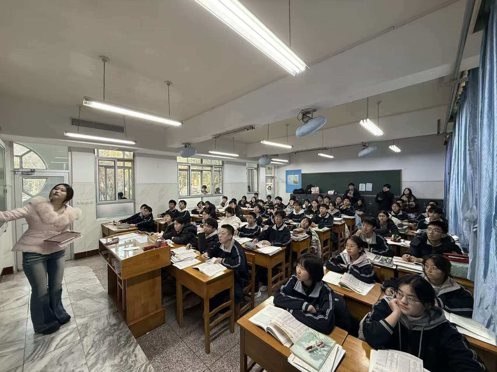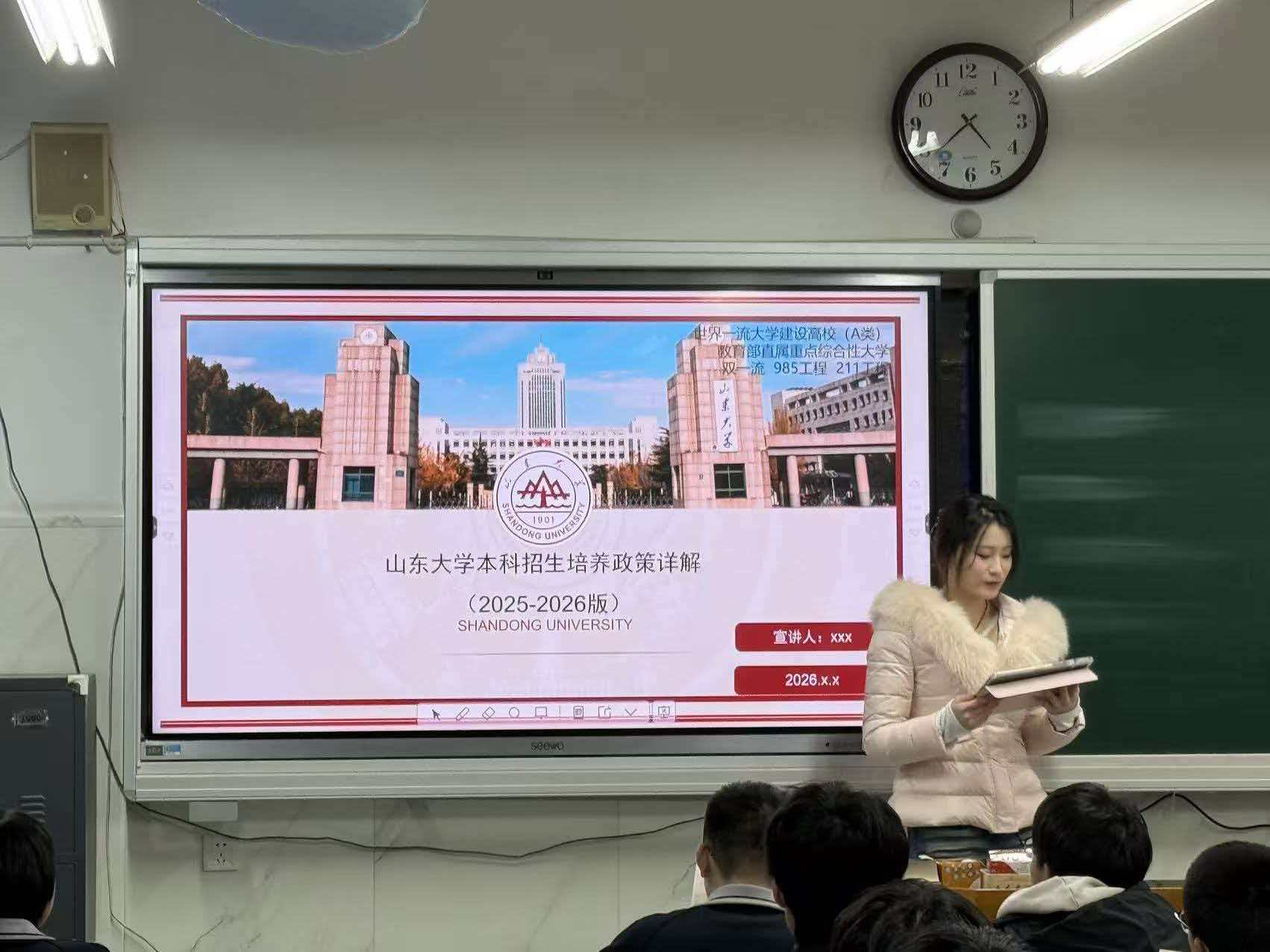 随后,宣讲队走进高一(9)班教室,与同学们展开面对面交流。队员们结合自身求学经历,将山东大学的百年校史、学科优势、师资力量、校园生活等内容娓娓道来,将“为天下储人才,为国家图富强”的办学理念融入生动的讲述。在分享高中阶段学习方法与心态调节技巧的同时,队员们也耐心解答了同学们对大学生活的好奇与疑惑。从“如何调整考前考后状态”到“大学生活是否真如网络所说那样轻松”,一个个鲜活的问题引发了热烈讨论,现场互动频繁、掌声不断。同学们专注聆听、认真记录,对山东大学有了更加直观深刻的认识。