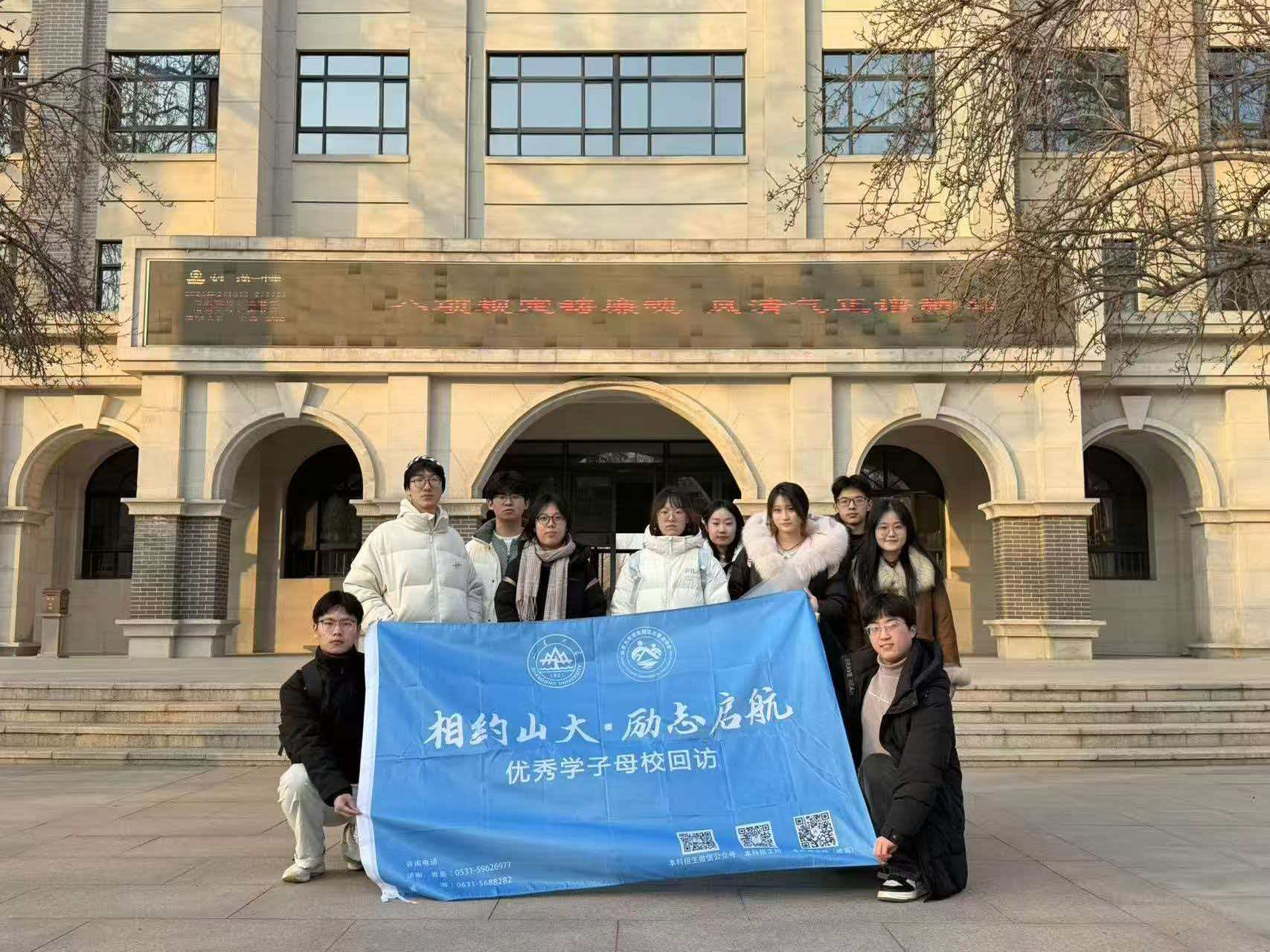 分享结束后,宣讲团为同学们分发山大定制宣传物料,招生政策、专业特色等实用信息被一一送到学子手中,为后续的学业规划提供参考。活动最后,队员们与班级同学合影留念,定格下这场青春相遇的美好瞬间。宣讲团还在学校行政楼前、校门口等地打卡留念,让山大风采与一中校园交相辉映,为此次宣讲活动画上圆满句号。