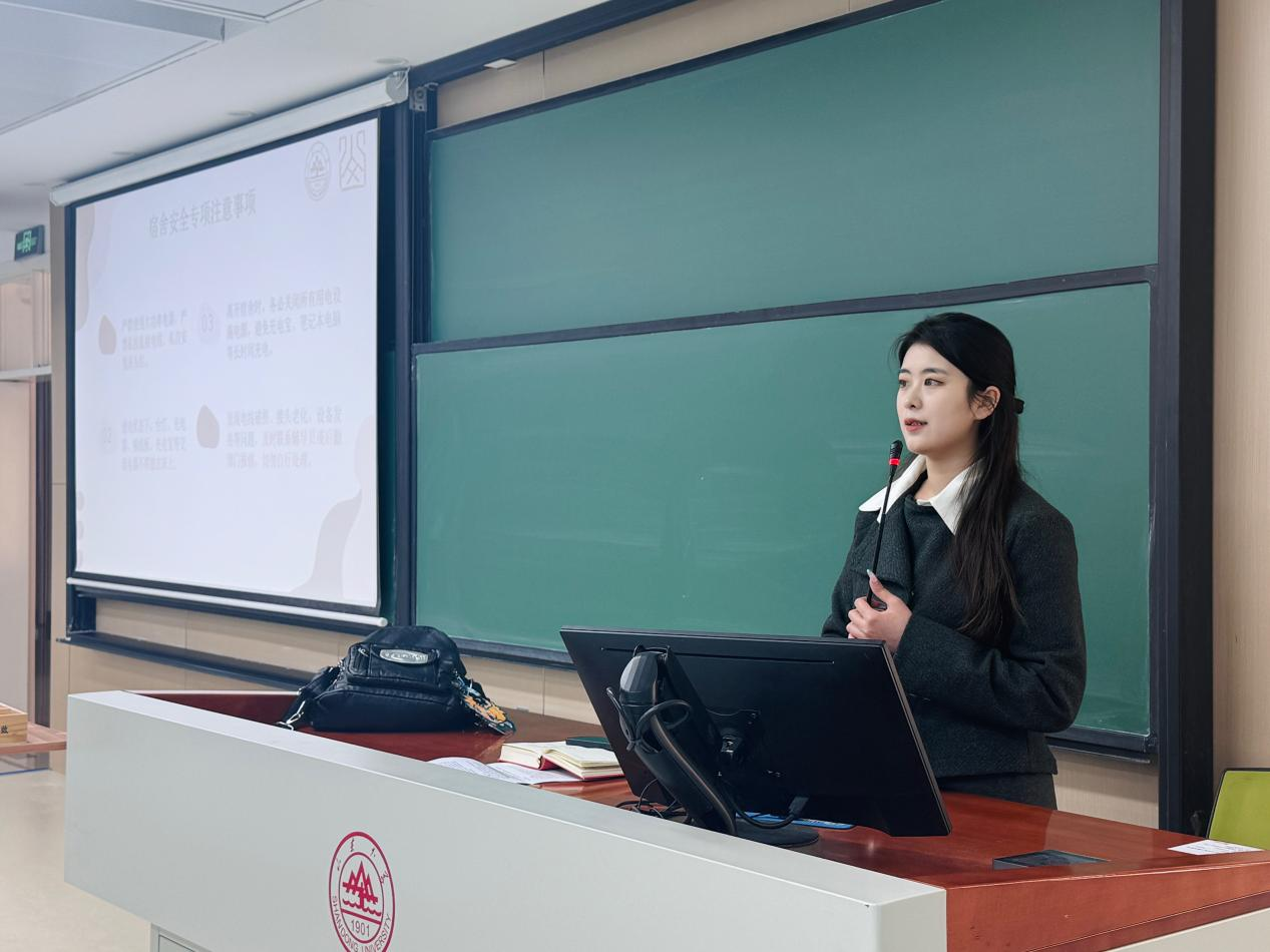 校园安全与考风考纪主题教育结束后,孙铭孺转入压力管理与心理调适主题分享。结合前期对同学们学习及生活中问题的调查结果,她围绕“如何平衡好学习和综测”展开讲解。她强调以学业为先,打好基础,达到课堂效率最大化;综测方面,鼓励同学们分阶段规划、有目标执行,制作一份“综测自评表”。随后,她介绍了山大心理咨询中心作为可靠的心理咨询平台,能为同学们提供心理疏导和帮助,并明晰了学生咨询服务的具体操作步骤。