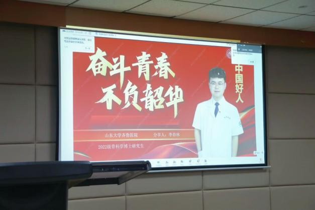 随后,活动进入榜样引领环节,“中国好人”称号获得者、齐鲁医院博士生李春林线上分享了他的实践经历。他结合一年内五次在公共场所成功救治病患、200场义诊、研发基层防治系统的实践经历,讲述了知识与劳动相结合的真切体会。他强调,“劳动不是学术的对立面,而是学术成长的土壤”,生动诠释了专业学习与社会担当的深度融合。最后他表达了对我院学子真正做到把论文写在祖国大地上的深情期许与“学在山大,快乐成长”的真挚祝福。