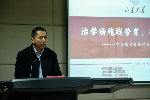 为贯彻落实劳动教育与学术培养深度融合的育人理念,引导青年学子在治学中坚定信念、在劳动中锤炼本领,2025年10月30日下午,我院于知新楼A620举办“治学铸魂践劳育,榜样聚力育新人”主题团日活动。文学院2025级硕士研究生辅导员张洪刚、山东大学齐鲁医院(第一临床学院)2022级博士研究生李春林,以及2025级硕士团支部、2024级拔尖班与汉一多班团支部全体学生出席此次活动。活动由2025级硕士团支部团支书孙铭孺主持。