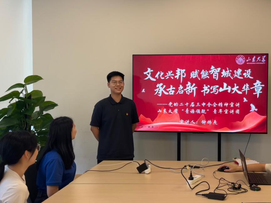 为深入学习贯彻党的二十大精神,深入领会落实习近平总书记关于青年工作的重要思想,进一步学习宣传贯彻党的二十届三中全会精神,不断增强党的创新理论学习宣传的感召力、凝聚力、影响力,山东大学“青语领航”青年宣讲团赴深圳市智慧城市科技发展集团有限公司开展宣讲,集团人力资源部兼党群工作部副部长王文修出席本次活动,人力资源部、党群工作部员工代表参与本次活动,活动由“青语领航”青年宣讲团队长钟炜焘主持宣讲。