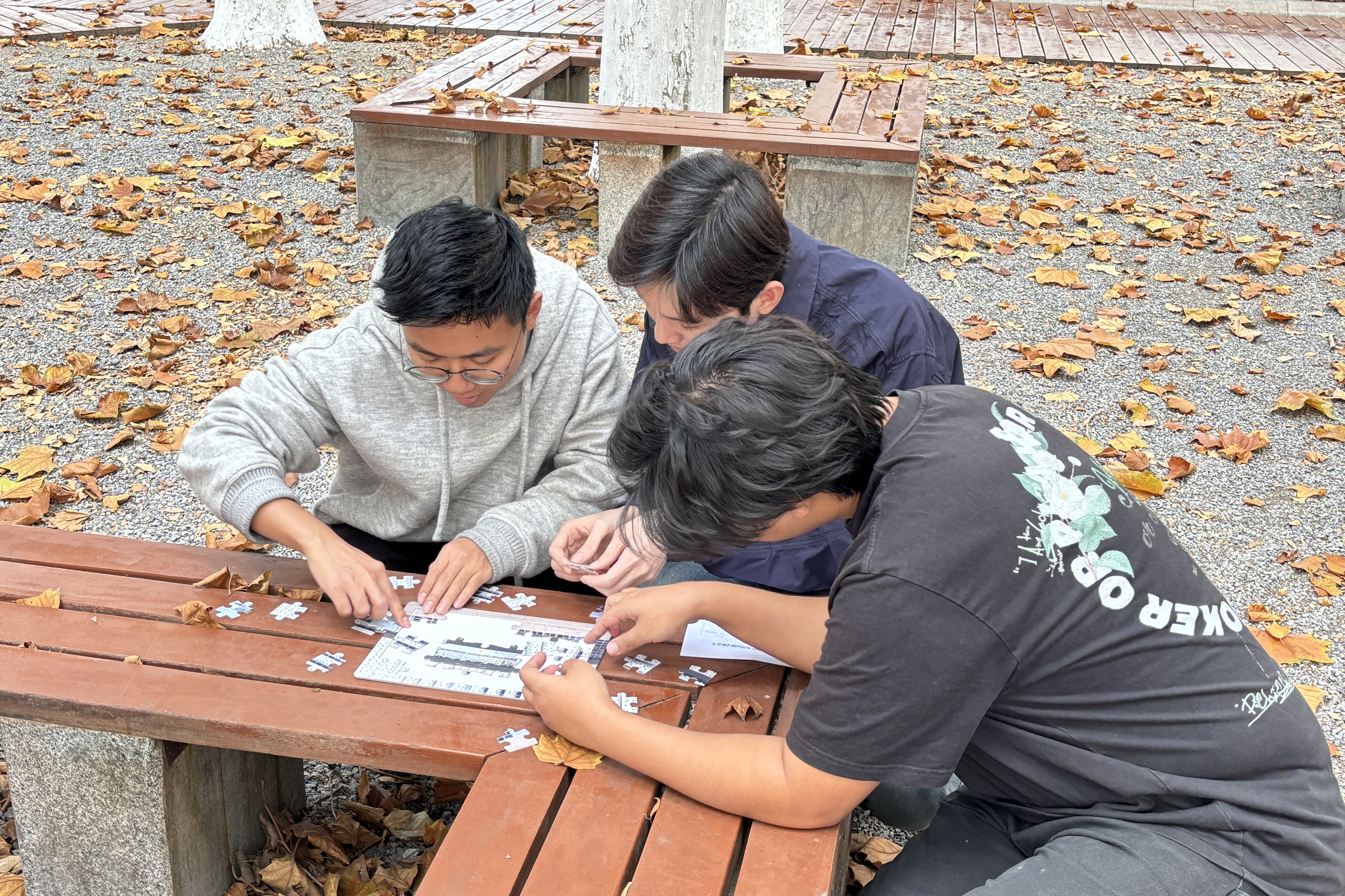 文渊林的白杨树下,团队共同完成一张校园拼图,将零散碎片还原为山大秋景,循着影像中的一草一木,感受美好的校园风光,体悟深厚的文化底蕴。
