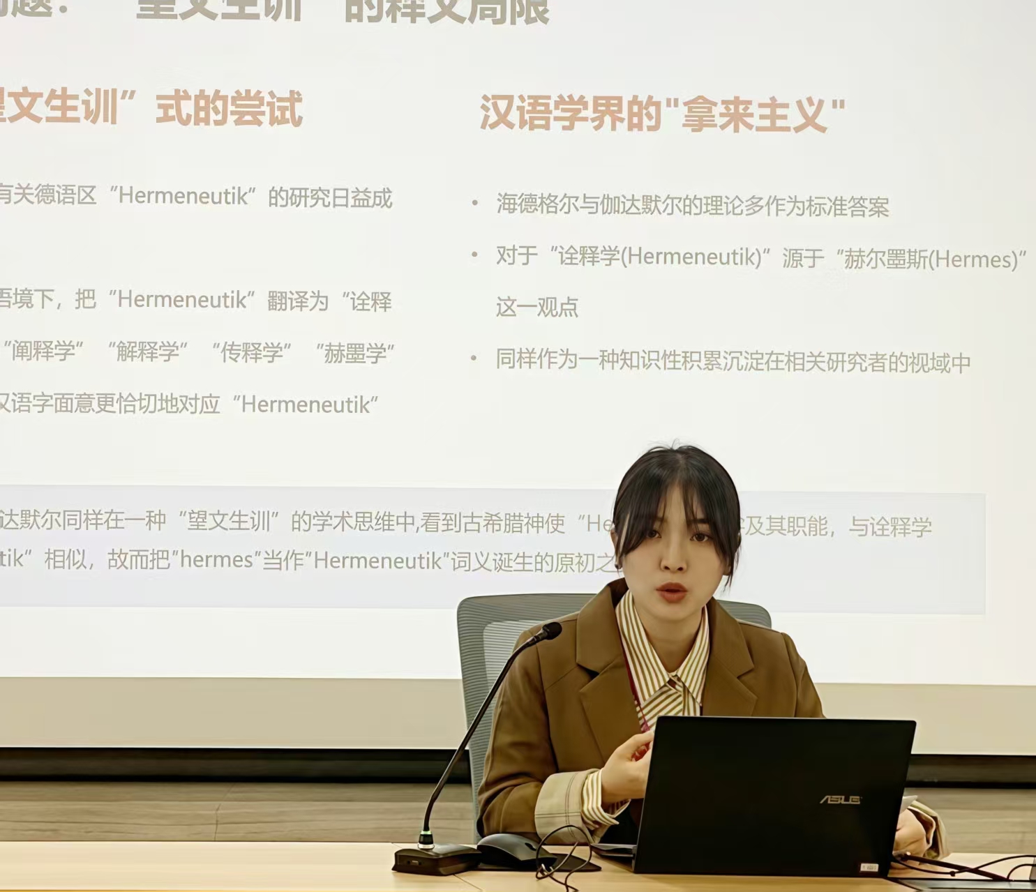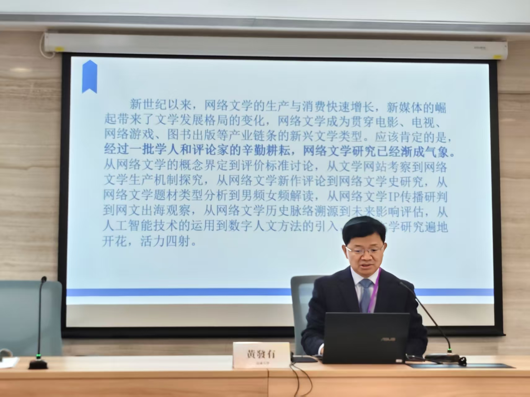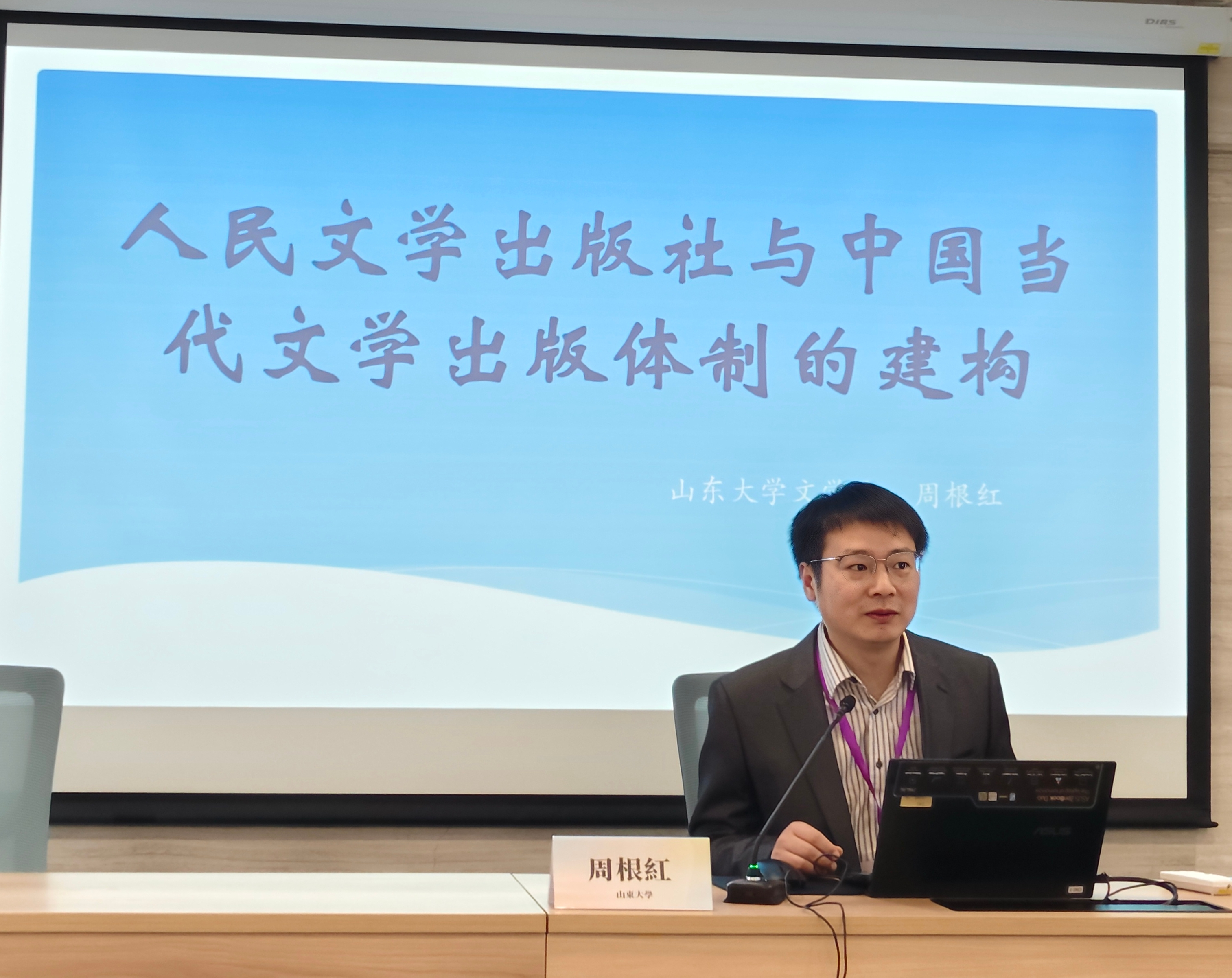 大会发言环节在冯景禧楼220室进行。黄发有院长向与会师生深刻且全面地分析了当代网络文学研究的进展与问题;杨建刚副院长系统阐释了中国现代审美启蒙的两条路径及其转换的内在逻辑;王涵老师发表了题为“诠释学源于赫尔墨斯吗?——文明互鉴与跨文化视域下‘Hermeneutik’语源新考”的精彩发言;李剑锋教授就“嵇康的史学修养与高士传写作”话题进行了详尽的说明;孙学堂教授通过精辟的阐发,探讨了“王尚䌹与明代复古思潮”这一论题;周根红教授则以“人民文学出版社与中国当代文学出版体制的建构”为题作了深入浅出的讲解。