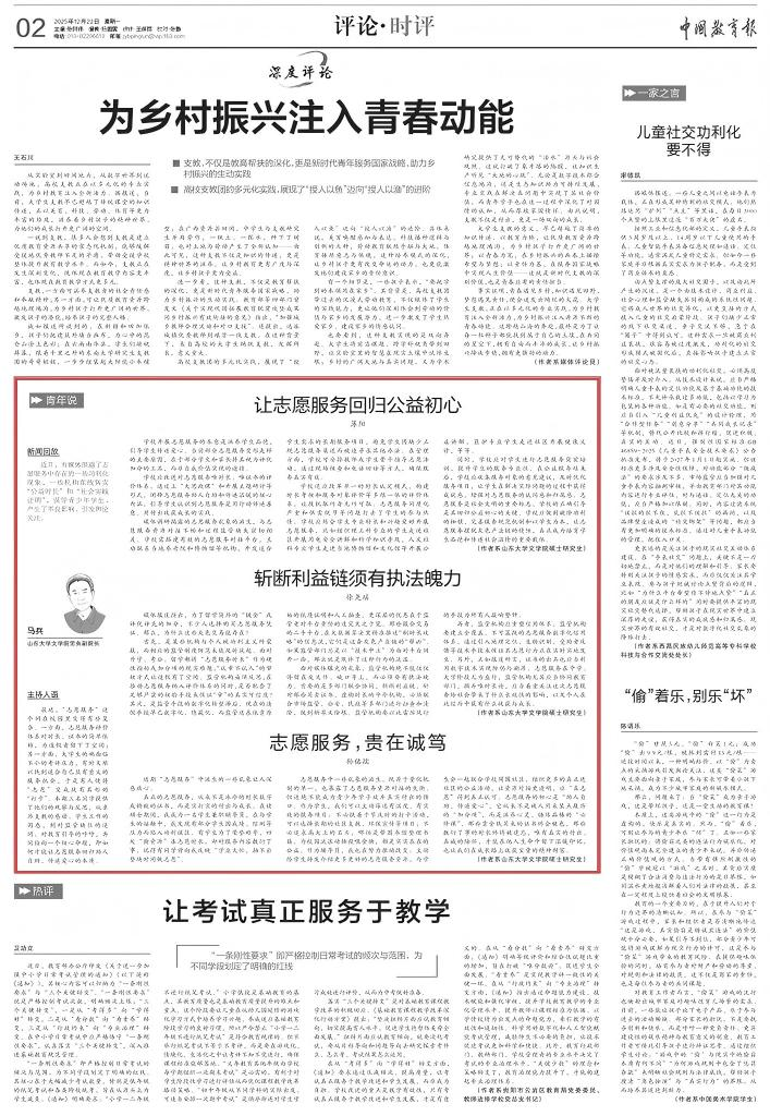 2025年12月22日,我院马兵教授,硕士研究生薄阳、徐尧瑶、孙铭孺针对媒体报道的志愿服务中存在的一些功利化现象在《中国教育报》“青年说”专栏发表评论。马兵是这一栏目的主持人。