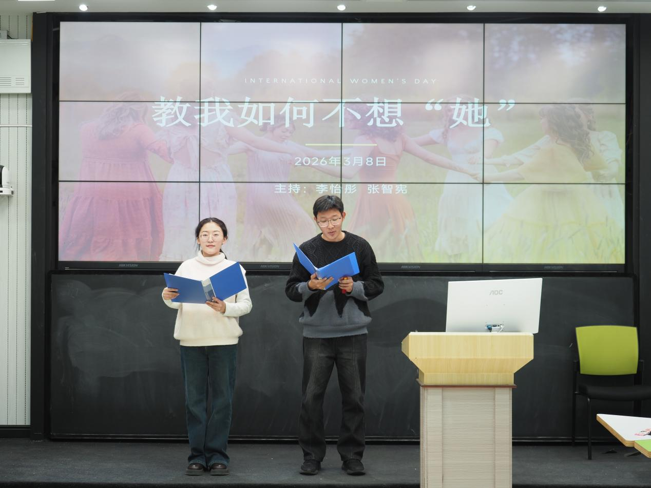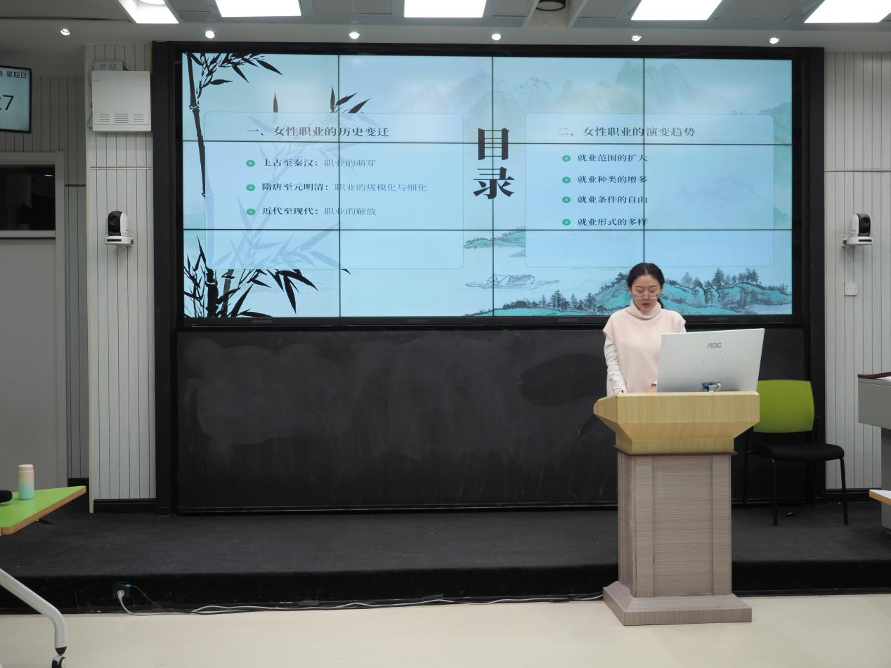 知识分享环节内容充实、视角多元。张智宪以全球视野为引,系统分享了全球女性力量的成长历程与创造实践,展现女性在世界舞台上的奋进足迹。李怡彤立足历史发展脉络,深度解读从古至今“她”职场的演进轨迹,呈现女性在职场领域的突破与担当。两位同学的分享兼具历史厚度与现实温度,为现场同学带来了深刻启发。