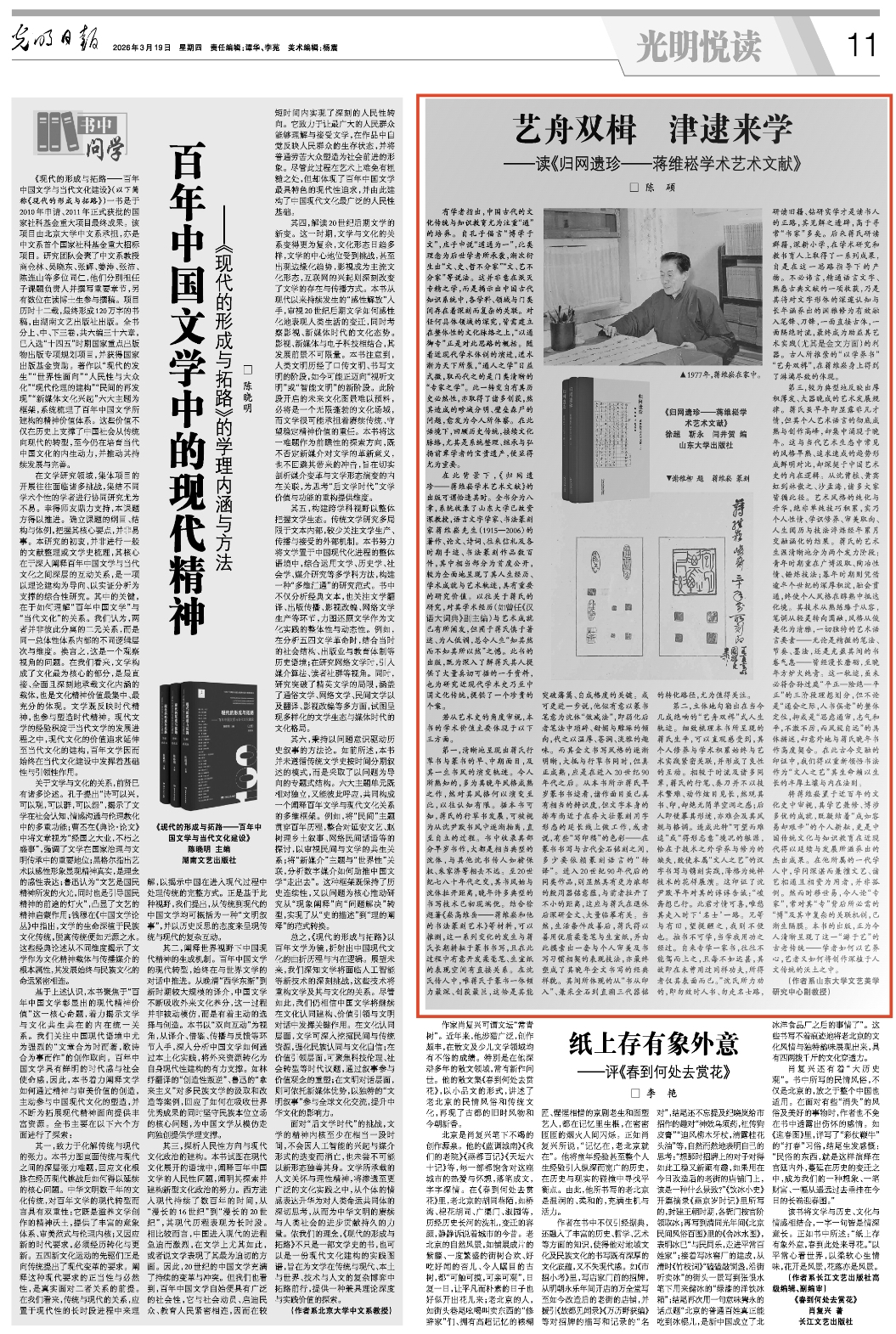 2026年3月19日,我院陈硕副教授在《光明日报》发表题为《艺舟双楫 津逮来学——读〈归网遗珍——蒋维崧学术艺术文献〉》的学术文章。