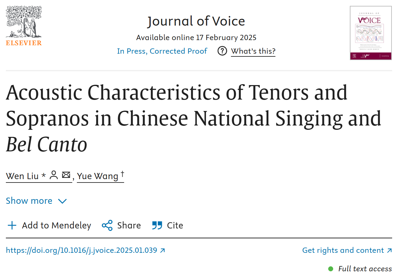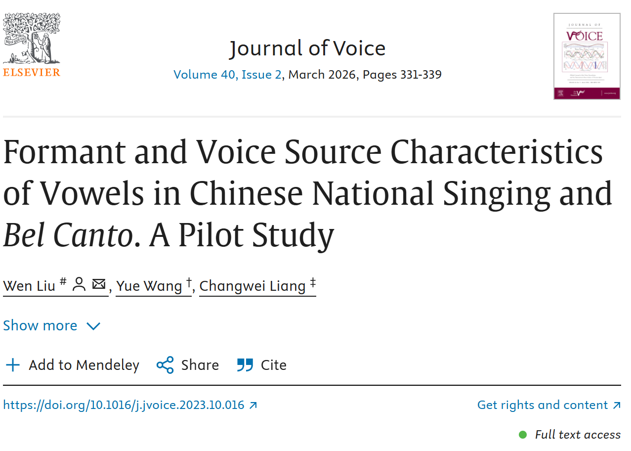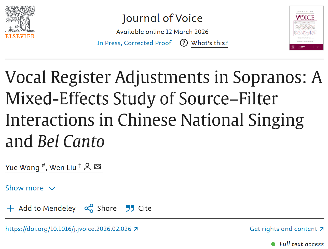 近期,我院刘文副教授团队围绕中国民族唱法与美声唱法的生理与声学机制开展系列研究,相关成果陆续发表于国际嗓音科学顶级期刊 Journal of Voice(SCI,JCR Q1;JIF:2.4)。其中,首篇论文Formant and Voice Source Characteristics of Vowels in Chinese National Singing and Bel Canto. A Pilot Study 由刘文副教授担任第一作者和通讯作者,我院硕士生王悦为第二作者(现为清华大学外文系博士生),北京大学语言学实验室工程师梁昌维为第三作者;该文于2023年在线发表,并于2026年正式刊发纸质版本。第二篇论文 Acoustic Characteristics of Tenors and Sopranos in Chinese National Singing and Bel Canto 由刘文副教授担任第一作者和通讯作者,王悦为第二作者(现为清华大学外文系博士生),于2025年在线发表。最新成果 Vocal Register Adjustments in Sopranos: A Mixed-Effects Study of Source–Filter Interactions in Chinese National Singing and Bel Canto 由王悦为第一作者,刘文副教授为通讯作者,于2026年在线发表。